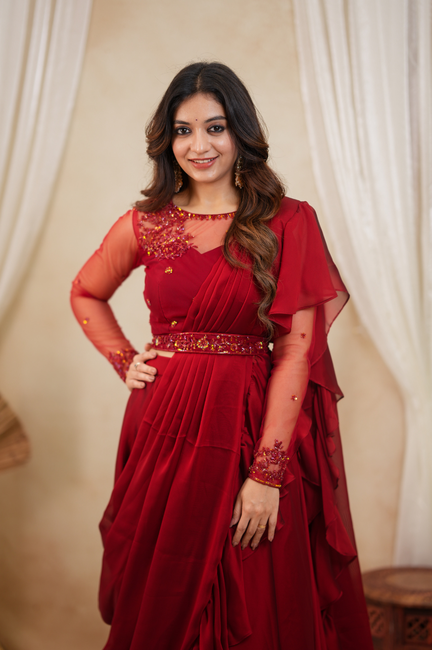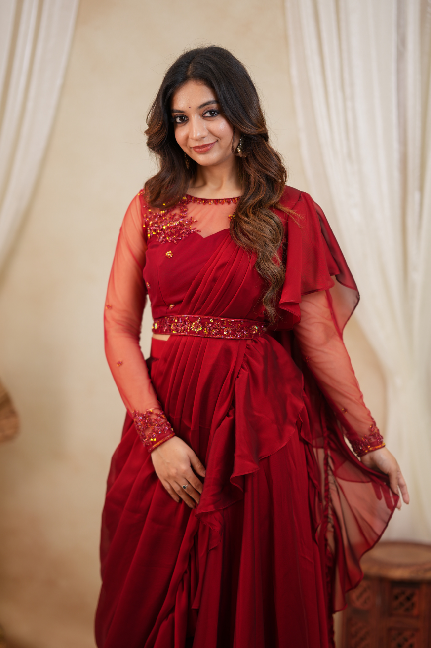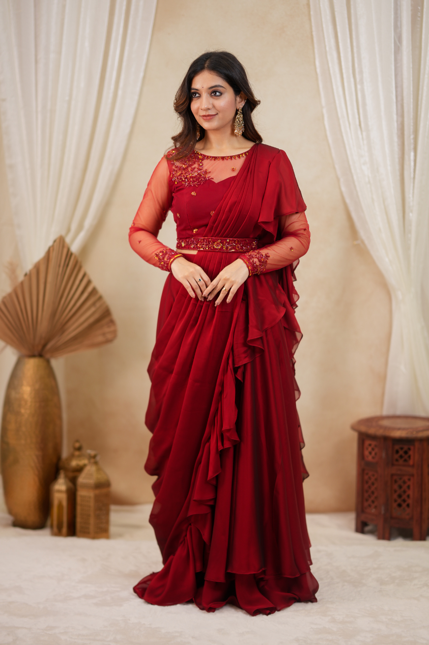 Layered drape lehenga skirt with pre-draped saree styling and ruffle details. Attached drape with ruffles (attached to skirt)