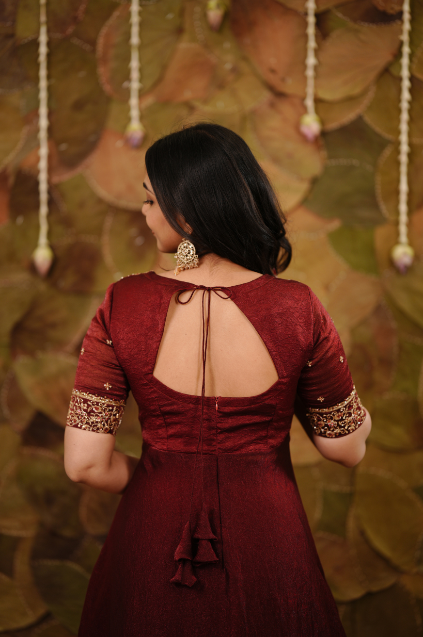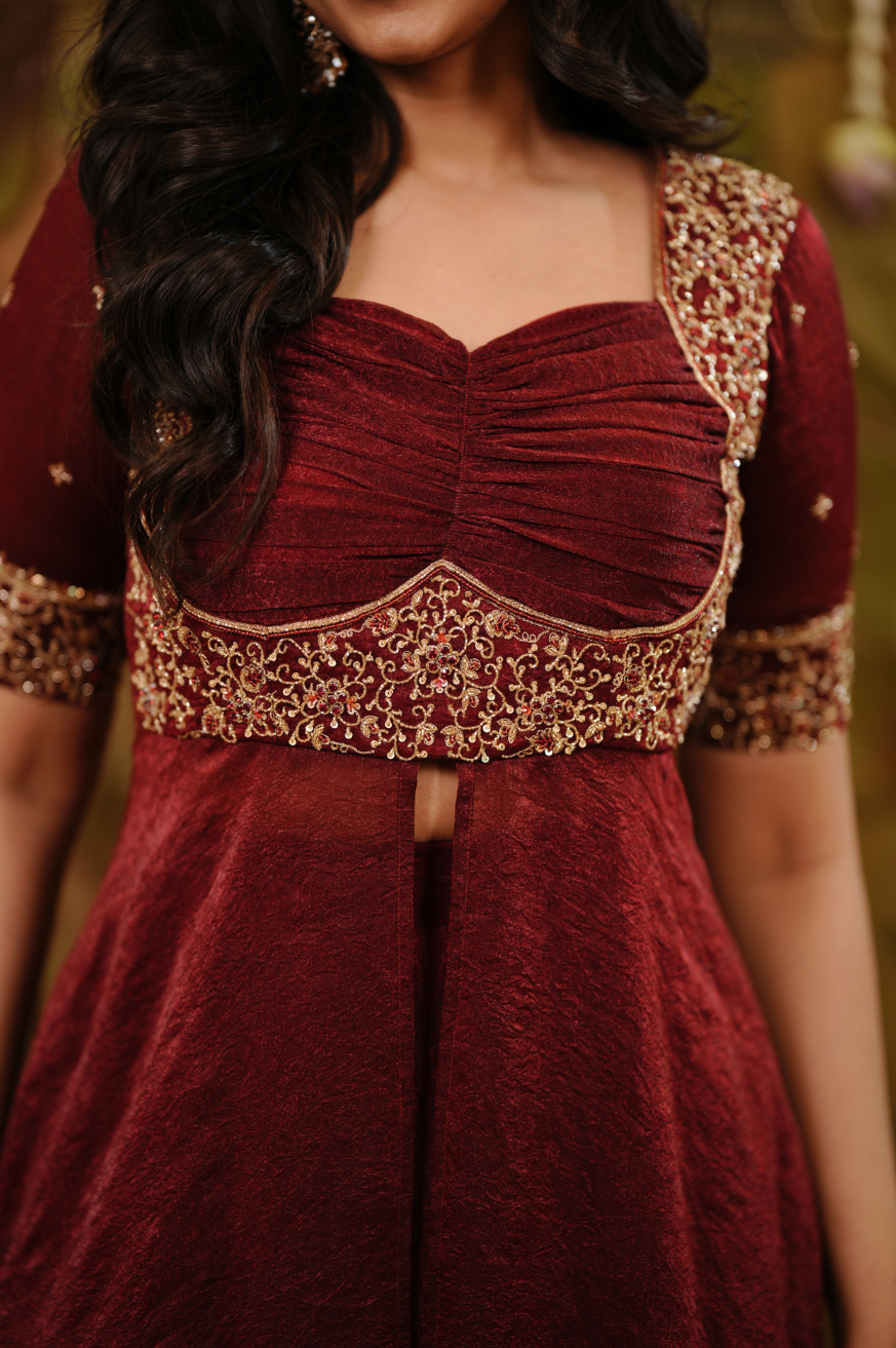 Wine blouse with a fully handworked peplum-style yoke, gathered centre detailing, elbow-length sleeves, and a fitted finish.