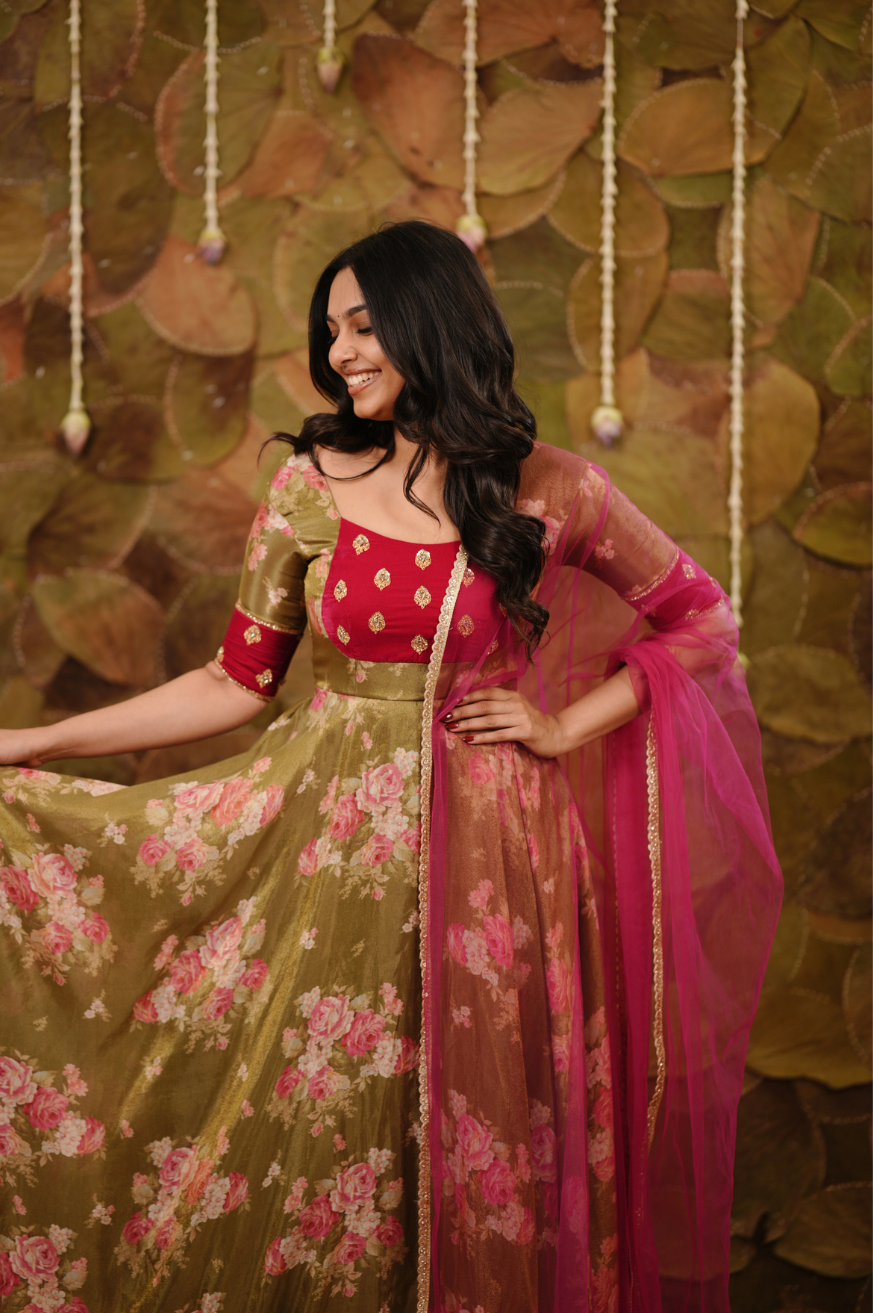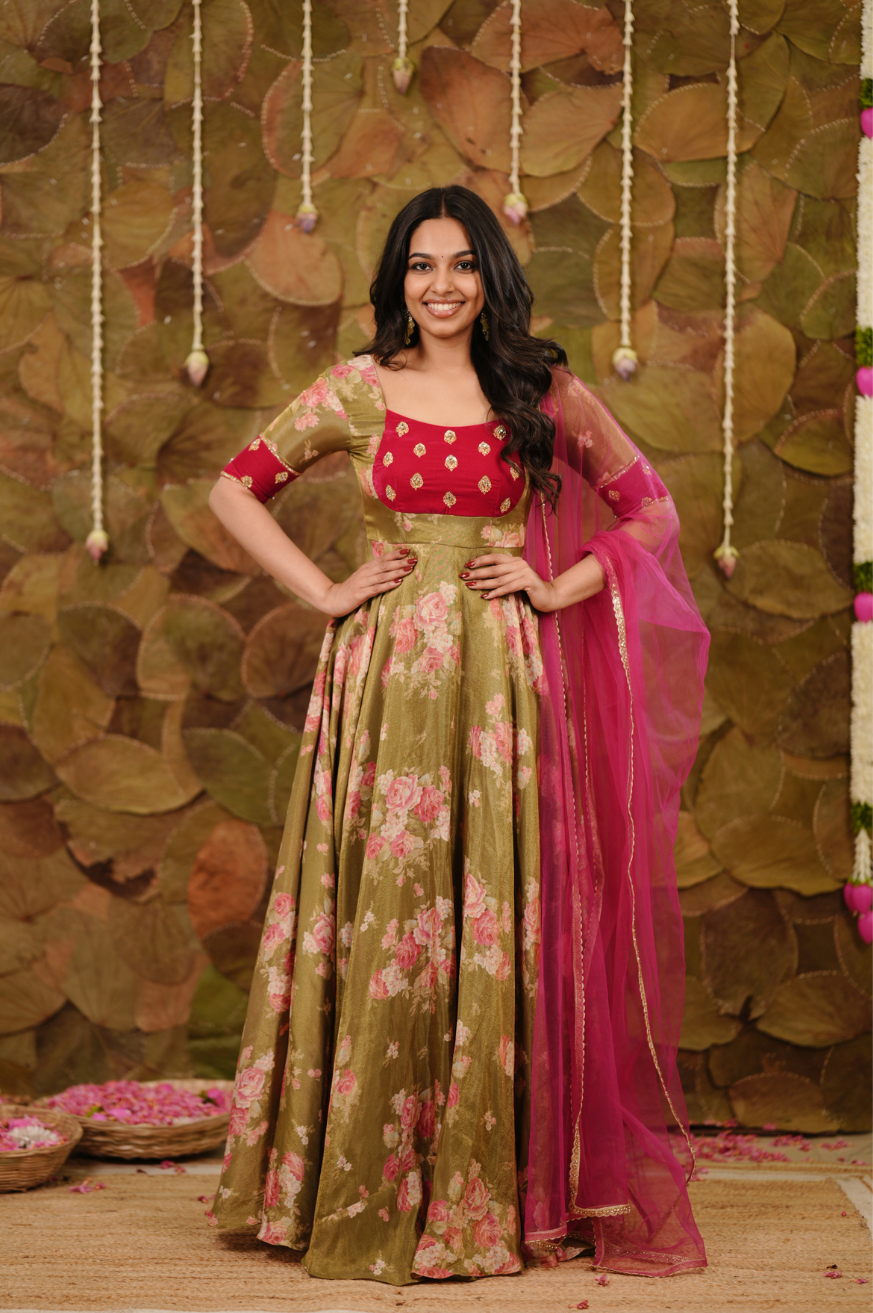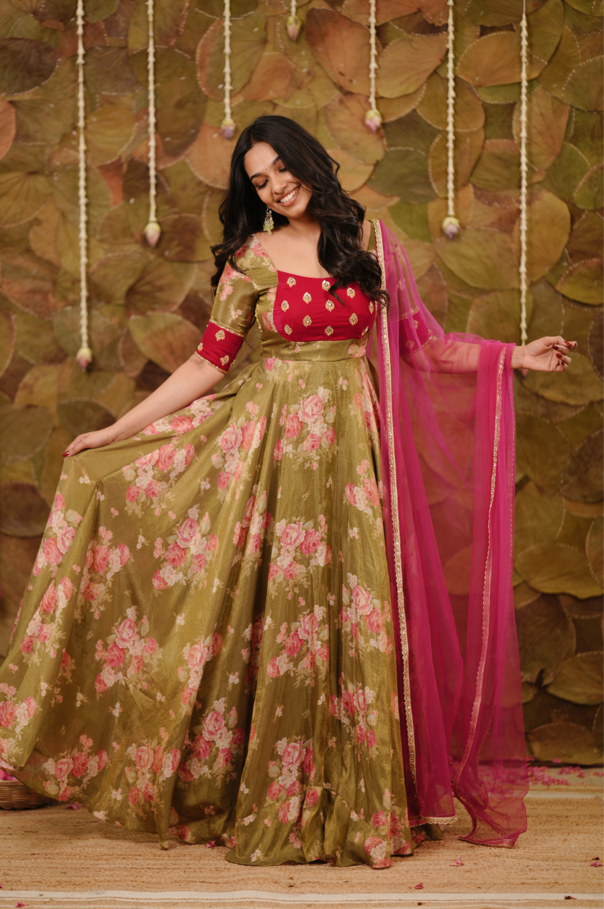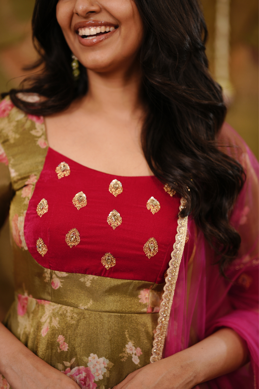 Olive green and pink floral Anarkali crafted in tissue fabric featuring a fully flared silhouette, handworked Rani pink velvet yoke with buta detailing, elbow-length sleeves, round neckline, and floor-length hem.