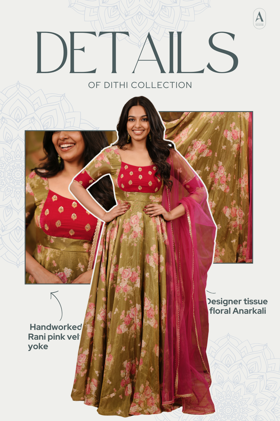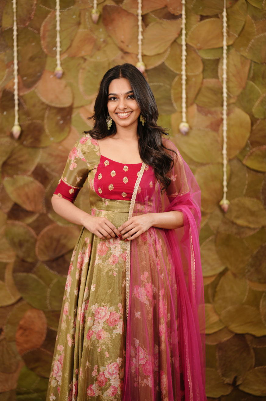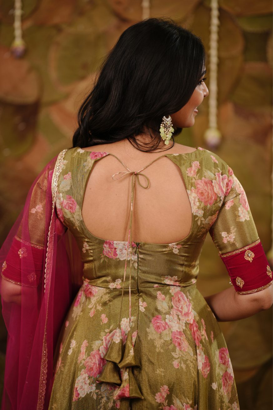 Olive green and pink floral Anarkali crafted in tissue fabric featuring a fully flared silhouette, handworked Rani pink velvet yoke with buta detailing, elbow-length sleeves, round neckline, and floor-length hem.