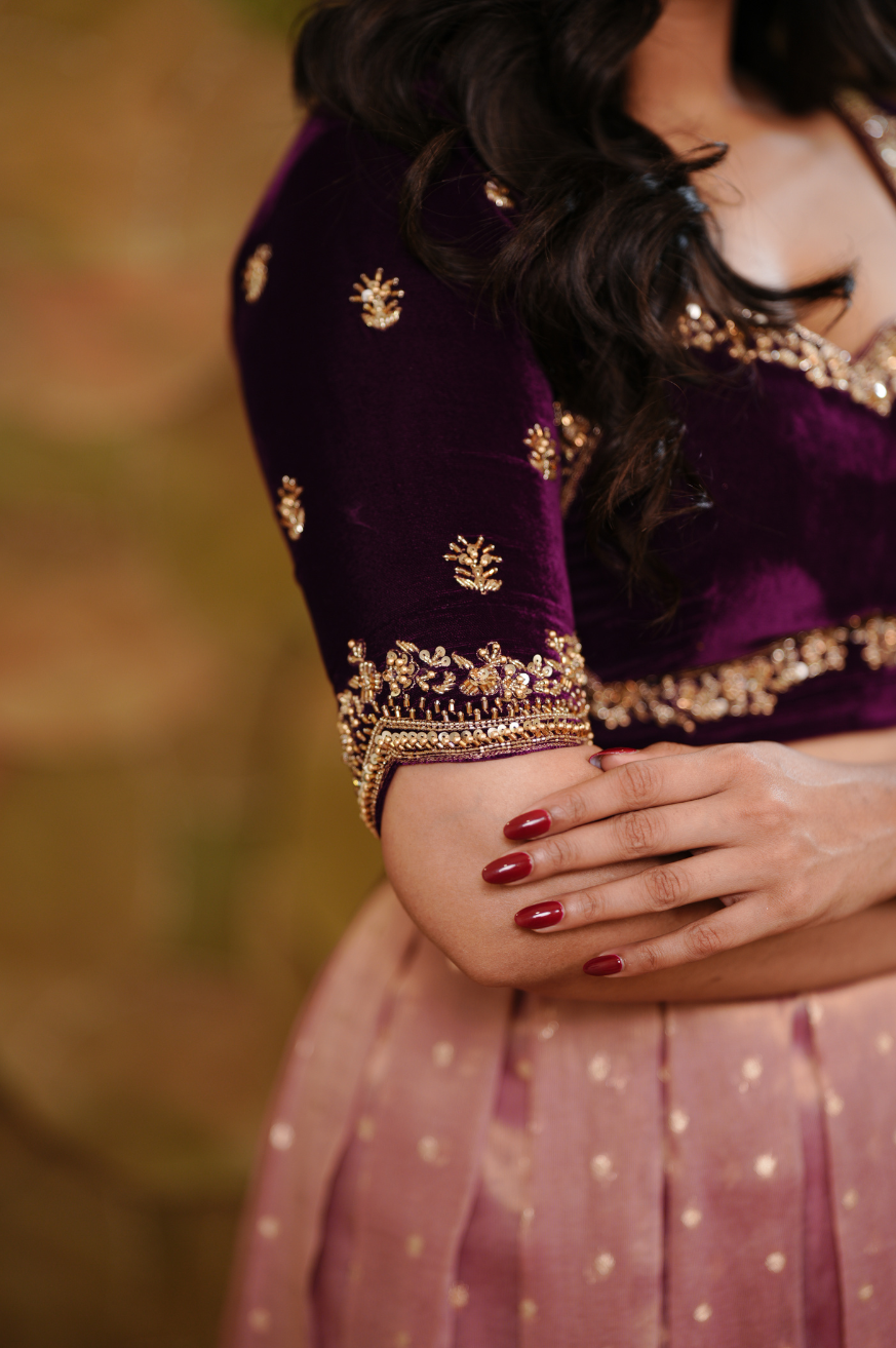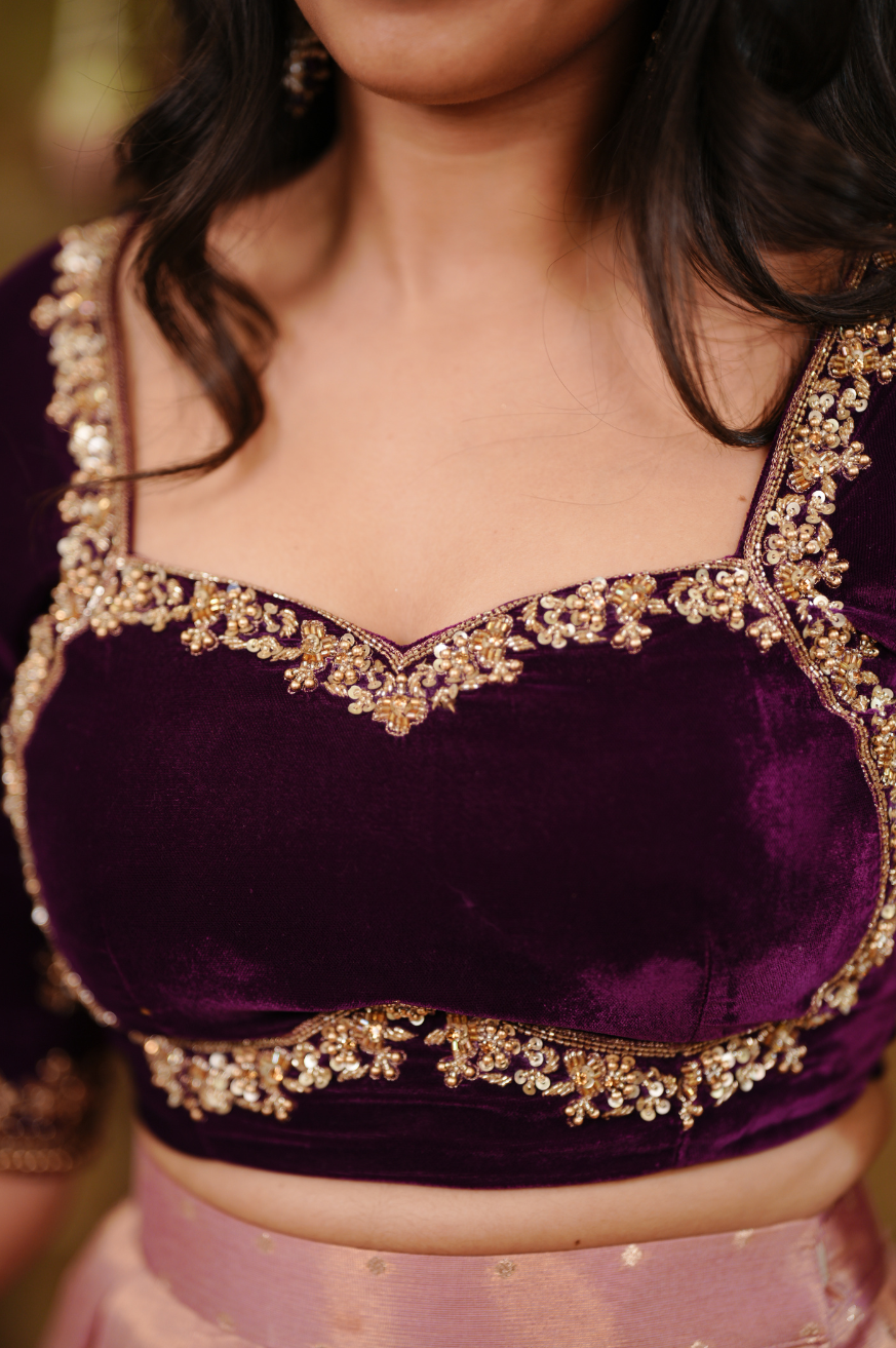 Wine velvet blouse with intricate hand embroidery on the yoke, elbow-length sleeves, and an oval-shaped back design.